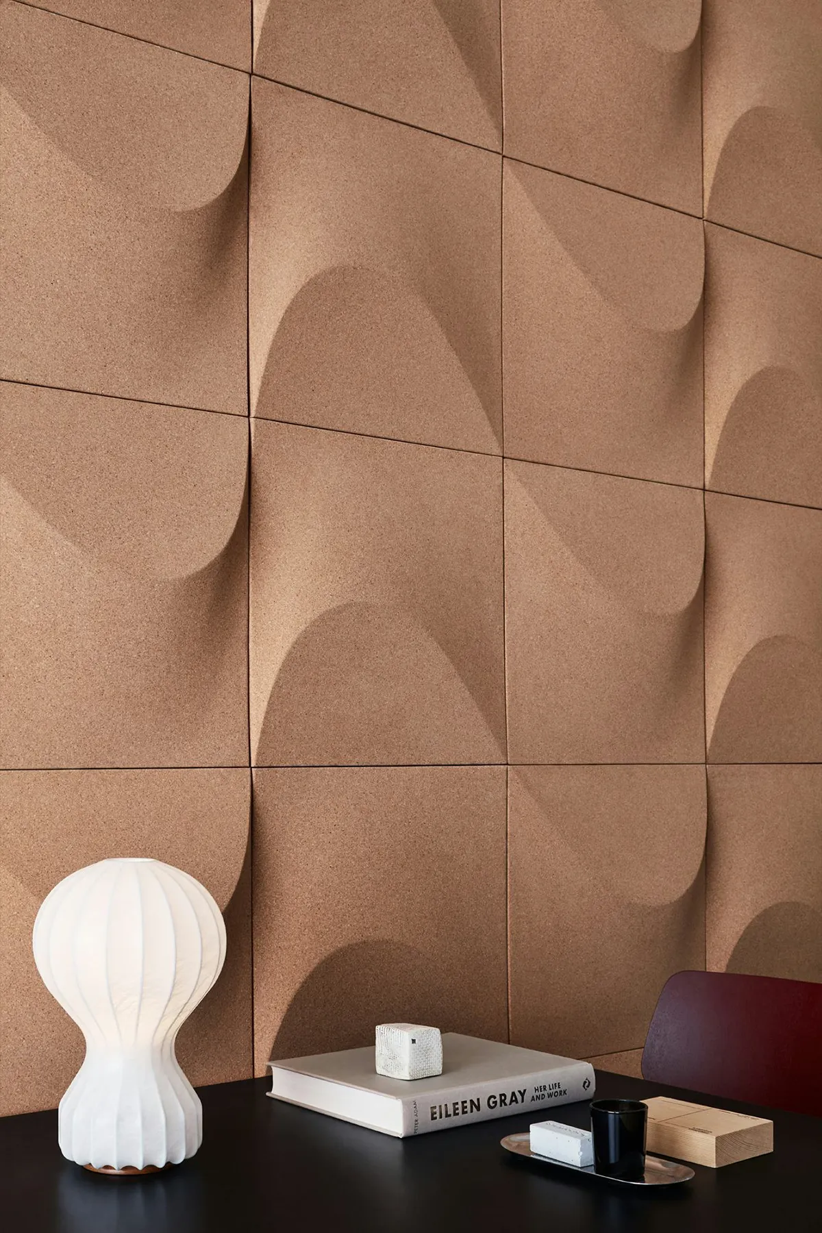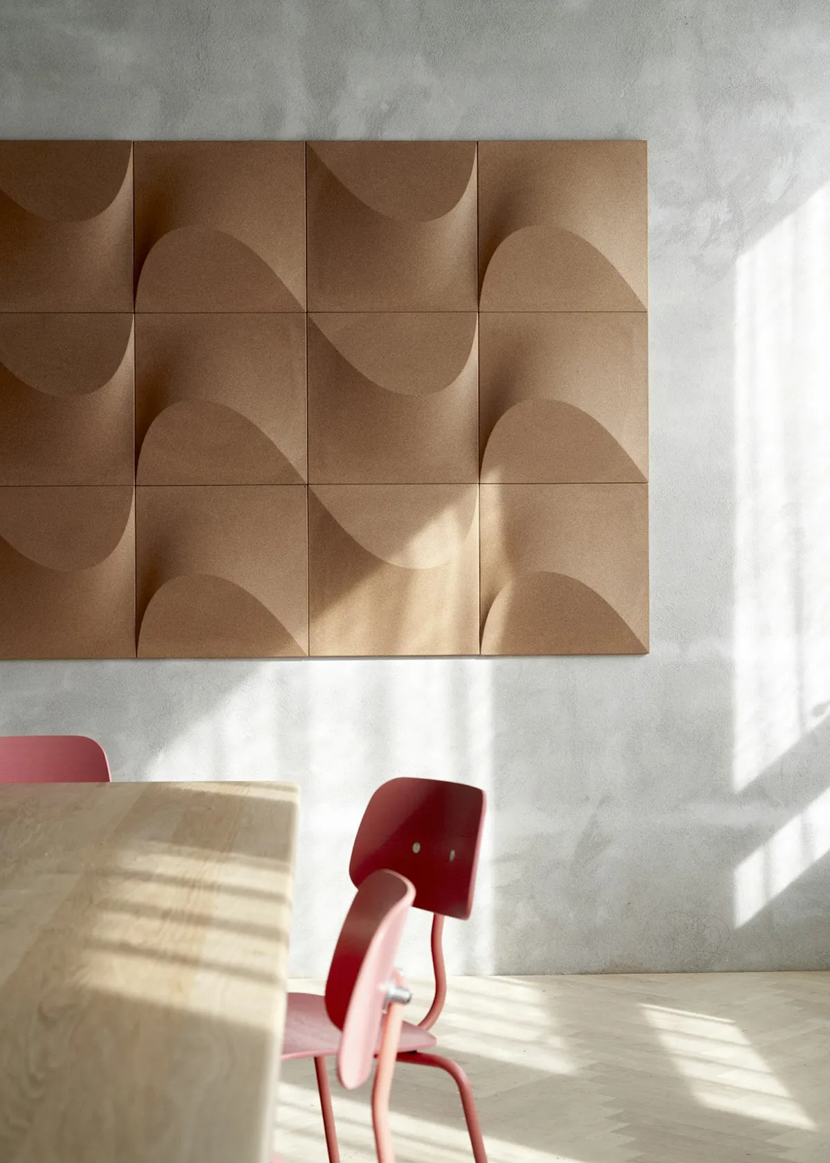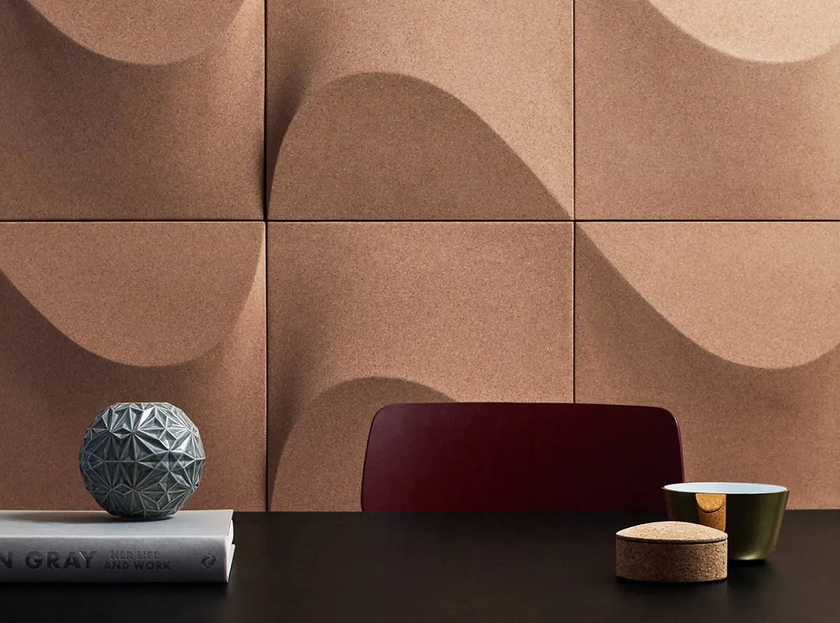 The wall panel created by Gabriel Tan is made of cork, a natural material that offers excellent acoustic properties. As simple and spontaneous as a sand formation carved by the wind, its shape is the perfect starting point for creating a multitude of patterns – from the asymmetrical to the symmetrical, from geometrically strict configurations to dynamic, random formations reminiscent of sand dunes.