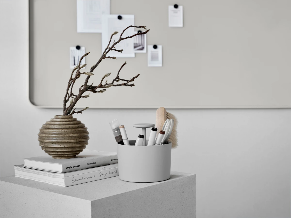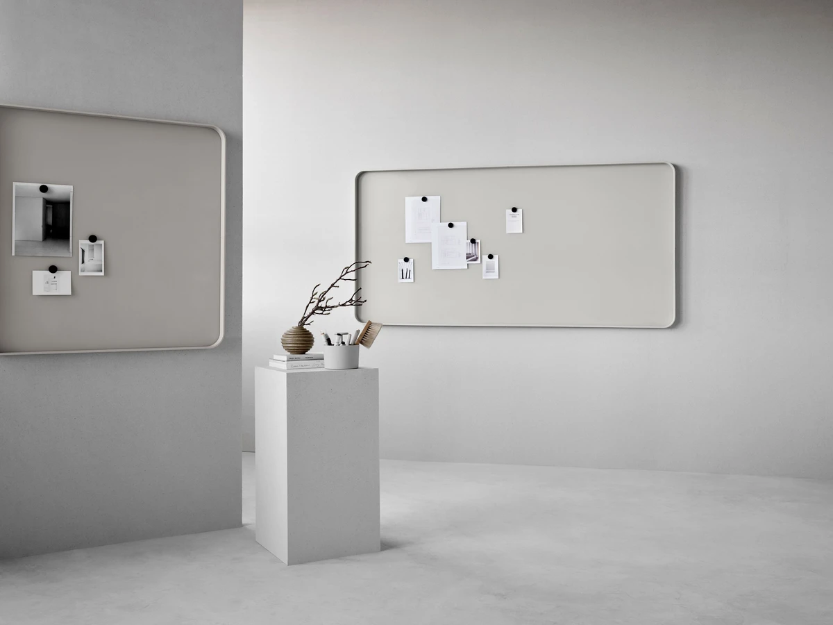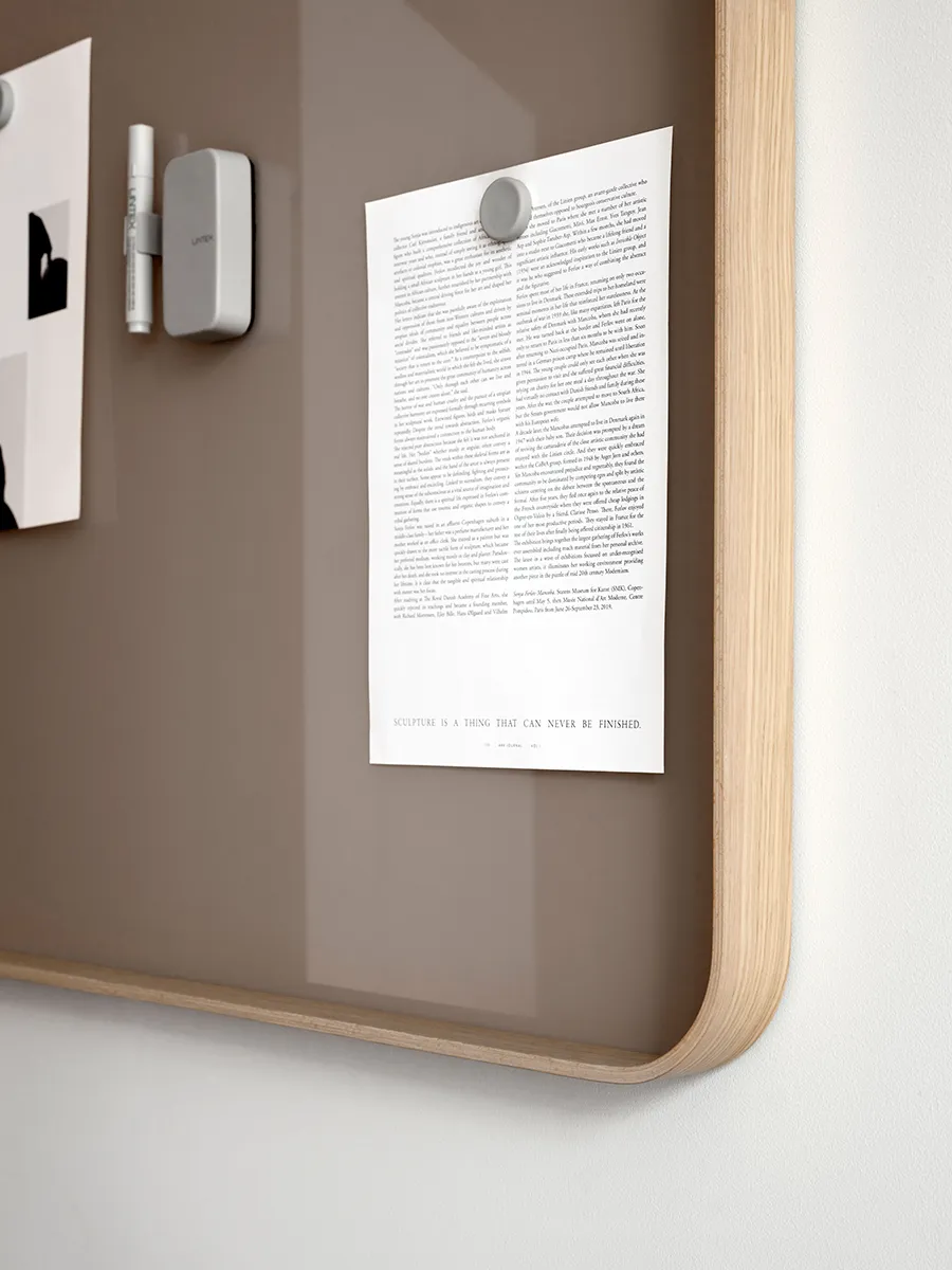 A premium writing board with a softly rounded bentwood frame available in grey lacquer or oak veneer finish. The depth of the frame outlines the board and doubles as a natural pen tray. The glass is available in any of our 24 standard colours. For a monochrome appearance we recommend the colour Soft - 150 combined with a grey lacquer frame. Designed by Halleroed and Matti Klenell.
